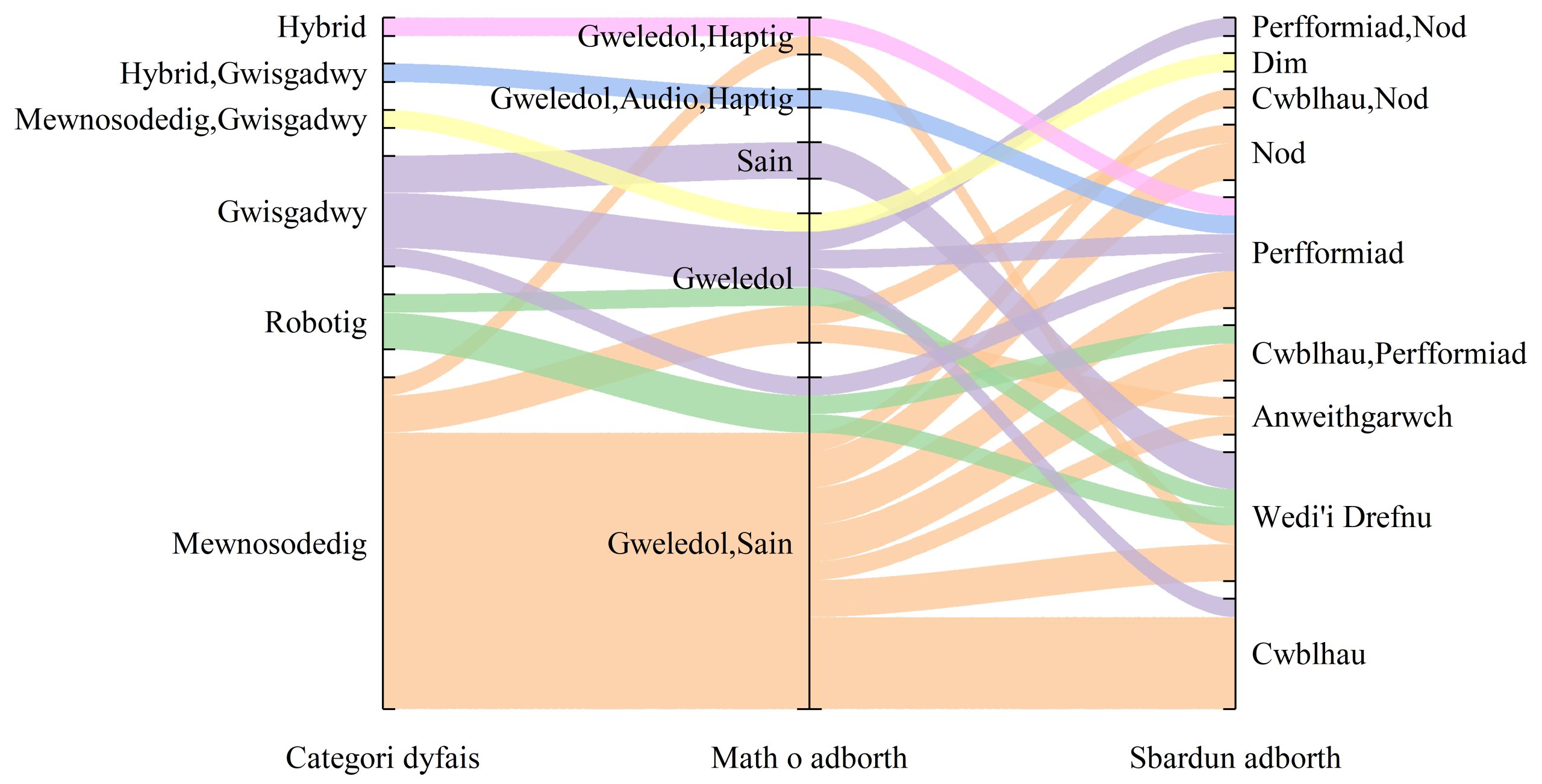 Mae'r adolygiad hwn yn dadansoddi categorïau dyfeisiau, dulliau synhwyro a rhyngweithio, mecanweithiau adborth, a'r Technegau Newid Ymddygiad (TNY) sy'n bresennol yn y systemau hyn (gweler Ffigur 2 a 3). Mae'r canfyddiadau'n dangos pwyslais cryf ar ddyfeisiau mewnosodedig sy'n targedu gweithgareddau cryfder a chydbwysedd, gyda mecanweithiau adborth sy'n bennaf weledol a strwythurau ysgogi sy'n gymharol syml. Er bod amrywiaeth o dechnegau y gellir eu dosbarthu fel BCTs yn bresennol, mae'r rhain yn aml yn ymhlyg neu'n deillio o briodweddau rhyngweithiol neu faterol y dyfeisiau eu hunain. Ar y llaw arall, nid ydynt wedi bod yn destun gwerthusiadau sylweddol i sicrhau bod y defnyddiwr yn parhau i gyflawni'r ymddygiad ar ôl i'r ymchwilwyr fynd a does neb yno i'w ceryddu os ydyn nhw'n rhoi'r gorau iddi. Felly mae'r adolygiad yn tynnu sylw at sail ddamcaniaethol gyfyngedig mewn llawer o'r gwaith presennol ac yn amlinellu ystyriaethau dylunio ar gyfer datblygu dyfeisiau gweithgarwch corfforol diriaethol yn y dyfodol (gweler Ffigur 4).
