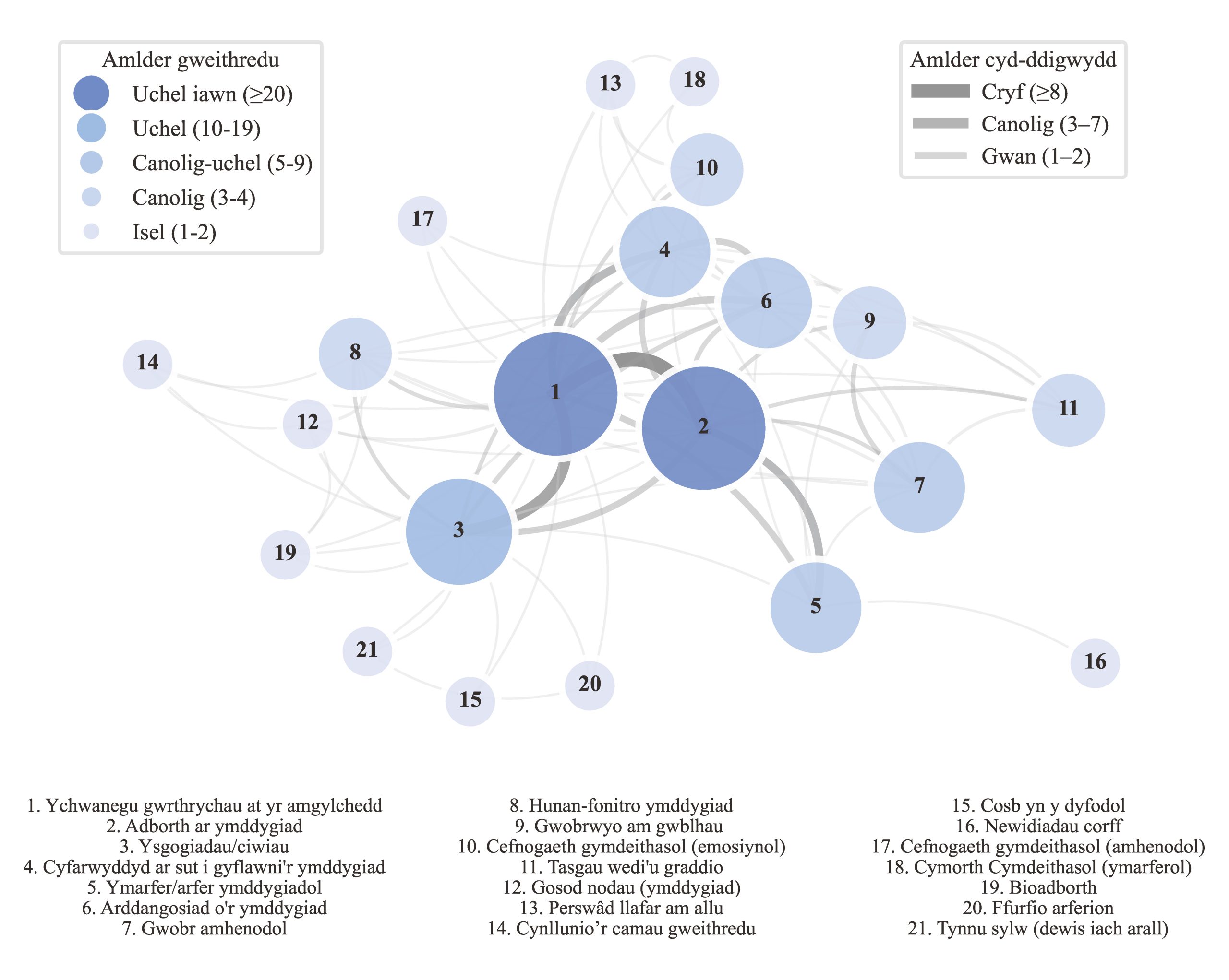Ffigur 3: Rhwydwaith TNY cyflawn gydag amleddau gweithredu a chyd-ddigwyddiadau. Mae maint y nod yn dangos pa mor aml y defnyddiwyd pob techneg ar draws systemau ac mae trwch y llinell yn dangos pa mor aml ymddangosodd technegau pâr gyda'i gilydd.