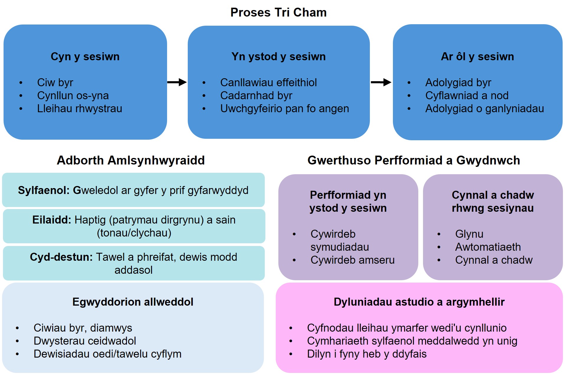 Ffigur 4: Trosolwg o ymyrraeth gweithgarwch corfforol benodol yn y cartref: proses tri cham (cyn/yn ystod/ar ôl sesiwn), cadarnhadau llwyth isel amlsynhwyraidd gyda dewis modd addasol, a gwerthusiad ar gyfer gwydnwch trwy ganlyniadau procsimol a distal gyda chynllun ar gyfer cyfnod lleihau ymarfer a dilyn i fyny.